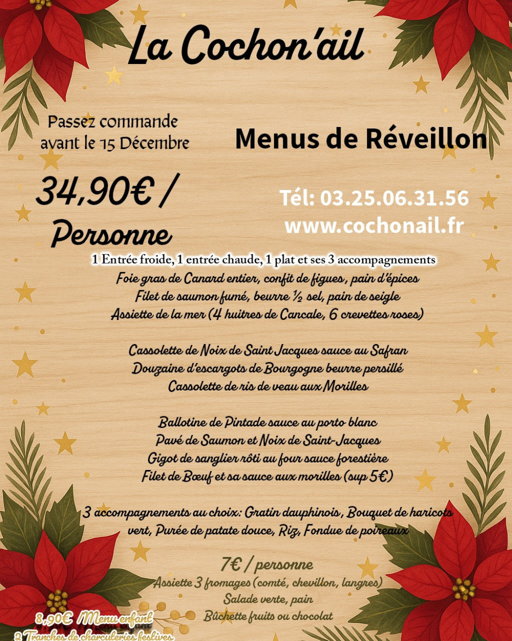 Découvrez nos menus de fin d'année, plus qu'à réchauffer tout sera prêt pour vous. En vous souhaitant de joyeuses fêtes. Le détail s'affiche en ajoutant les menus à votre panier.